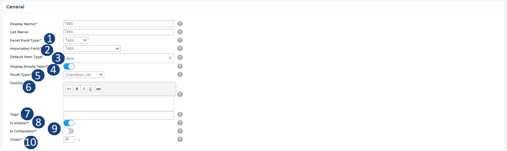 - Optional field to enter helper text that will appear as a tooltip when users hover over the facet label.